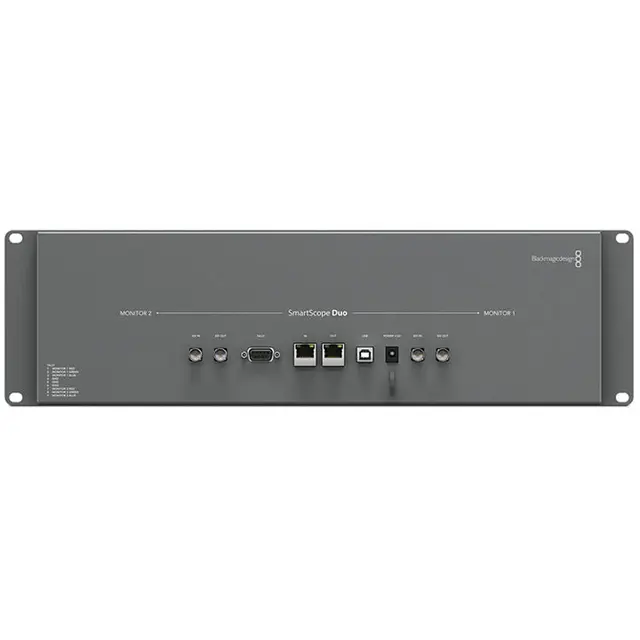 Blackmagic Design SmartScope Duo 4K rackmonterte Dobbel 6G-SDI-monitorer er en monitorløsning for studio- og locationproduksjoner, og viser video med oppløsning på opptil 3840 x 2160 ved 30 p. Den har to 8-tommers monitorer med en loop-through SDI-inngang og -utgang. Inngangene har automatisk sensor / valg, slik at du ikke trenger å bekymre deg for å matche inngangsformatet; monitoren vil vise det formatet som du mater den med.