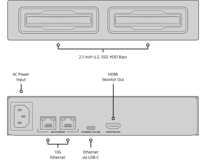 Blackmagic Cloud Dock 2 lar deg dele opptil 2 uavhengige 2,5 tommers disker over et høyhastighets 10G Ethernet-nettverk. Bare plugg inn SATA-harddisker og SSD-er, eller U.2-disker med ekstrem ytelse for utrolig rask fillesing og skriving. Du kan også synkronisere filer globalt ved hjelp av Dropbox og Google Drive sync og se all lagrings-, tilkoblings- og synkroniseringsaktivitet i sanntid på en skjerm koblet til HDMI-monitorporten. Blackmagic Cloud Dock 2 har 2 10G Ethernet-porter og en Ethernet over USB-C-port i en halvbredde, enkelt rack-enhet, noe som gjør den svært bærbar nettverkslagring som er perfekt for high-end film- og TV-bruk