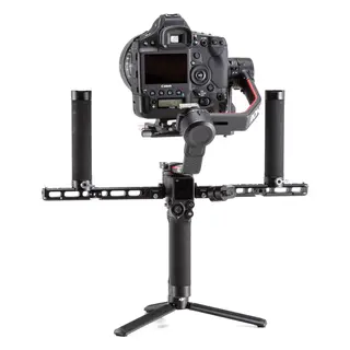Normalt festes begge armene til det valgfrie Twist Grip Dual Handle direkte til NATO/RSA-portene på sidene av gimbalen. Men i dette tilfellet må en kompakt adapter plasseres mellom gimbalen og en av armene.