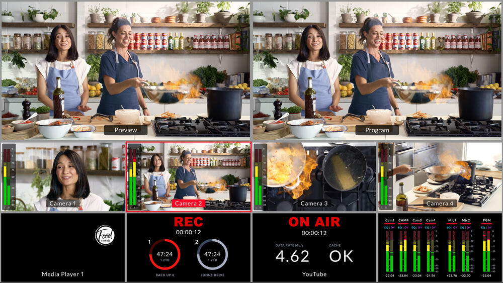 Multiview gir deg full oversikt over alle innganger, preview og program på én skjerm, med tally, lydmetre og status for opptak og streaming.