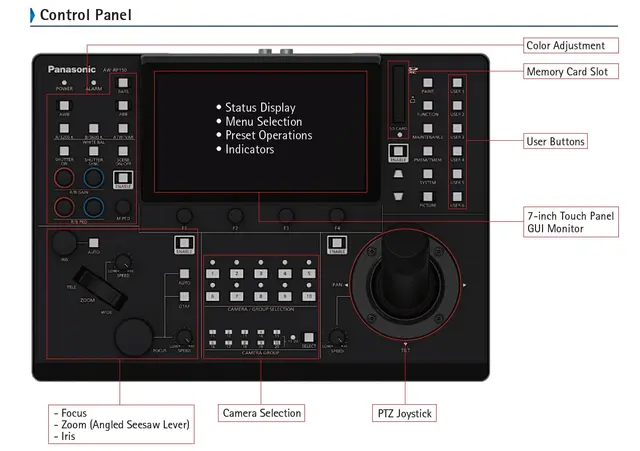 Panasonics kamerakontroller med berøringsskjerm lar deg kontrollere opptil 200 kompatible Panasonic PTZ-kameraer over IP via en HUB. Eller du kan kontrollere fem kameraer via direkte RS-422-tilkobling. Se listen over støttede kameraer i funksjonsdelen nedenfor. Kontrolleren har en zoom-/fokusvippe på joysticken for panorerings- og tiltoperasjoner, mange innebygde knapper og tilleggskontroller på 7" LCD-berøringsskjermen. Den har også et SD-kortspor som gjør det mulig å lagre scenefiler, systeminnstillingsfiler og andre kamerainnstillinger samt kopieringsinnstillinger over to andre kameraer Kontrolleren kan drives over Power-over-Ethernet eller en 12V, 4-pins XLR-strømforsyning, selges separat.