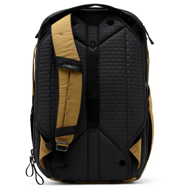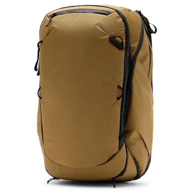 Den coyote-fargede Travel Backpack fra Peak Design har ekspansjonsglidelåser langs det romslige hovedrommet, slik at du kan justere kapasiteten fra 30 til 45 liter. For å organisere innholdet ytterligere er det separat tilgjengelige rom fra Peak Design, som kan brukes til å oppbevare kamera-, video-, lyd- og digitalt medieutstyr, samt klær eller små elektroniske enheter.