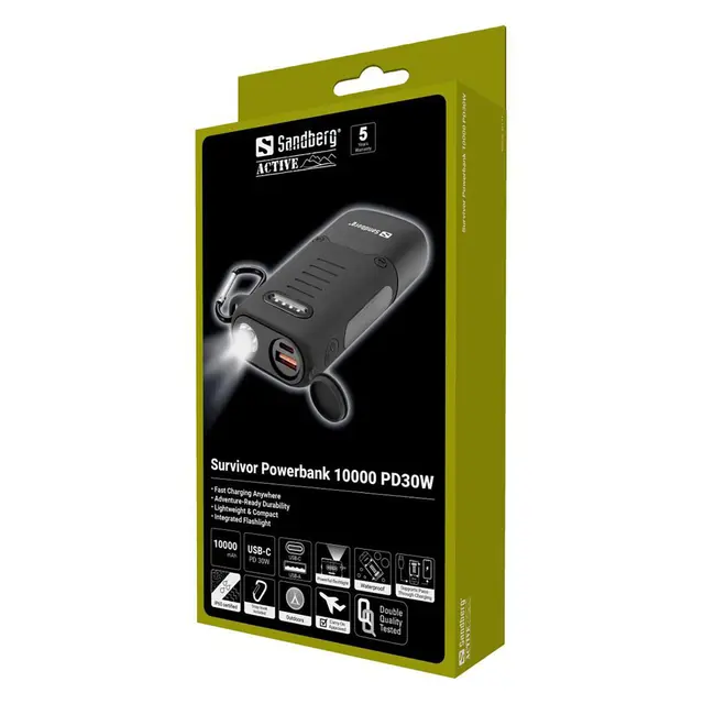 Sandberg Survivor Powerbank 10000 PD30W er en lett og kompakt strømbank for deg som trenger rask og pålitelig lading – uansett hvor du er. Med USB-C PD 30W og USB-A kan du lade enhetene dine lynraskt og effektivt. Denne strømbanken er bygget for å håndtere selv de tøffeste miljøer, ettersom den er både vann- og støvtett og har IP65-sertifisering. Perfekt for utendørseventyr! Den integrerte lommelykten med rekkevidde på 12-15 meter sørger for at du alltid har lys tilgjengelig.