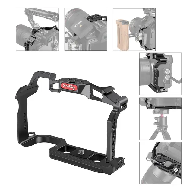 Du kan feste SmallRig Top Handle 1984 eller HTN2439, SmallRig Wooden Sidehåndtak 2093 for håndholdt skyting, og SmallRig kabelklemme 2981 for å beskytte HDMI- og USB-C-kablene. Festene iARRI-stil på toppen og siden er utstyrt for å feste SmallRig ARRI Locating Handle 2165 eller SmallRig Ball Head Magic Arm 2115. Rem-festerer inkludert for å legge til en separat tilgjengelig håndrem PAC2456 , PSW2398 eller nakkestropp PSC2428 til riggen din. I tillegg er en skrutrekker innebygd i bunnen av buret for å stramme kameraskruen.