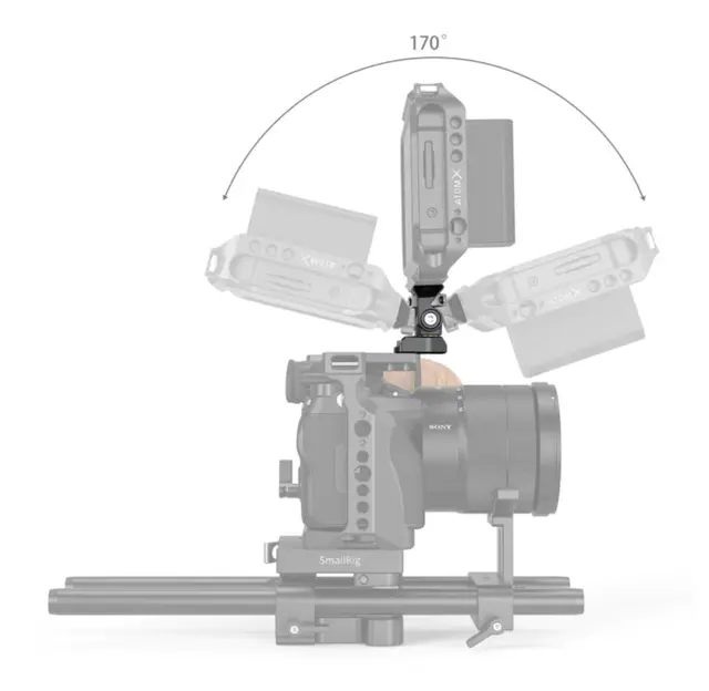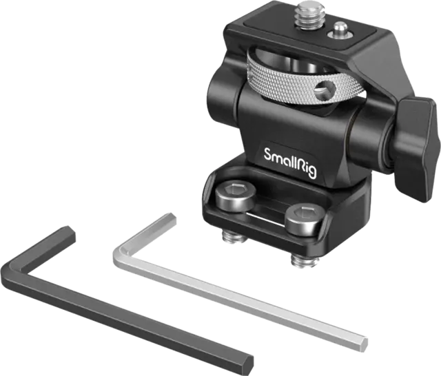 SmallRig Swivel and Tilt Adjustable Monitor Mount med skruer Mount 2904 er designet for å holde skjermen på kameraburet eller annet monteringssystem via to medfølgende 1/4“-20 skruer. Den har 1/4 ”-20 skrue på toppen for å feste skjerm, lys eller mikrofon. Holderen gjør det mulig å svinge 360° sidelengs og vippes 170 °. Den robuste monitorholderen er CNC-maskinert aluminium og kan støtte 5 ”og 7” skjerm opptil 1,5 kg. Sving- og tiltfeste har beskyttende gummipolstring på toppen og inkluderer en unbrakonøkkel for å stramme festene for ytterligere sikkerhet. Bunnen med to 1/4 ”-20 gjengede hull for flere DIY-alternativer.