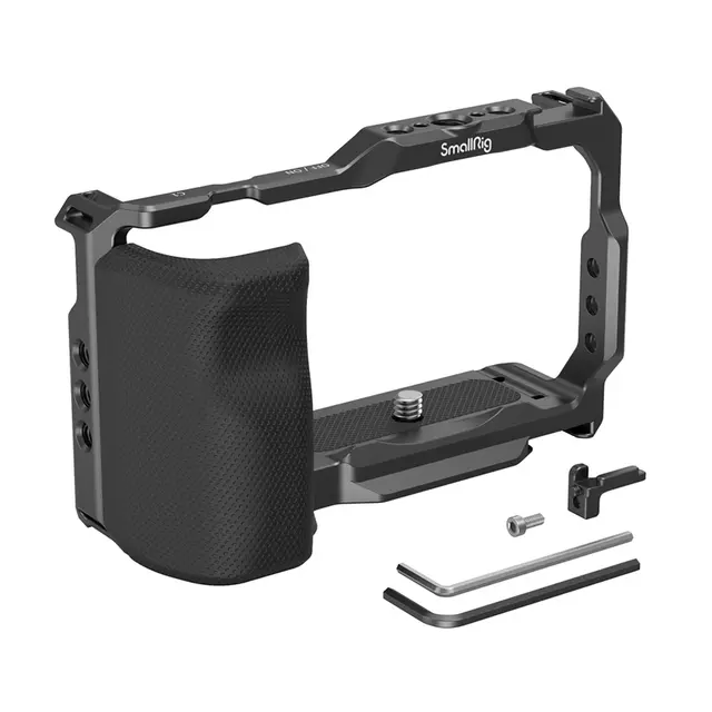 SmallRig Cage 3538 med Grip for Sony ZV-E10 er designet for å gi tilbehørsløsninger og en bedre grepopplevelse. Buret er låst via en 1/4"-20 skrue i bunnen og videre med en medfølgende vridelås for å forhindre vridning. Buret beholder tilgang til knapper, kortspor, batterirom og flip-skjerm. Ergonomisk utformet avtagbart silikongrep deler den samme teksturoverflaten med kameraet for å forbedre integriteten. Buret har flere innebygde 1/4"-20 gjengede hull og ARRI 3/8"-16 lokaliseringshull som støtter topphåndtak som HTS 2756 for lavvinkelskyting, eller holder for bærbare strømbanker BUB2336 for å feste en strømbank for kontinuerlig strømforsyning, med et utskåret spor igjen ved batteridøren for dummy-batterikabel, slik at kameraet kan plasseres flatt på bordet når bruker et dummy-batteri. Den leveres med ett coldshoe-feste både øverst og nederst for mikrofon og LED-lys som en komplett vlogging-løsning. Arca-type hurtigutløserplate på bunnen festes direkte til et stativ av typen Acra for rask bytte mellom håndholdt, stativ, opptaksscener for stabilisator, og de nedre gjengede hullene er kompatible med DJI RS 2/RSC 2 stabilisator hurtigutløserkort (øvre) for å forbedre opplevelse av stabilisatorfotografering. Buret har gummiputer på toppen og bunnen inni for å forhindre riper og leveres med en magnetisk flatskrutrekker for enkel demontering og montering.