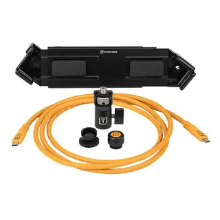 Tethering-sett som inneholder superrask USB-C kabel, holder for nettbrett med diagonal størrelse opptil 355 mm samt TetherGuard kabellås som monteres på nettbrettholderen. Settet gjør det mulig å montere nettbrettet ditt på et stativ, tilbehørsarm osv. og koble opp kameraet via den raske USB-C kabelen. Skaper en trygg arbeidsstasjon enten du jobber i fotostudioet eller på location.